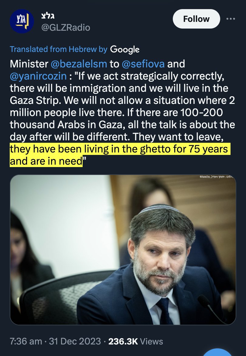 20231231 - Israeli radio station posted a response by colonizing terrorist minister, Bezallel Smotrich on Germany's WWII "double standard" over the word ghetto, while the Israelis are busy turning entire Gaza into a ghetto.