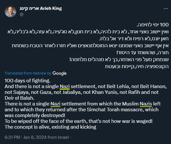 20240108 - Israeli colonist, Arieh King, on the nazified view of Gaza