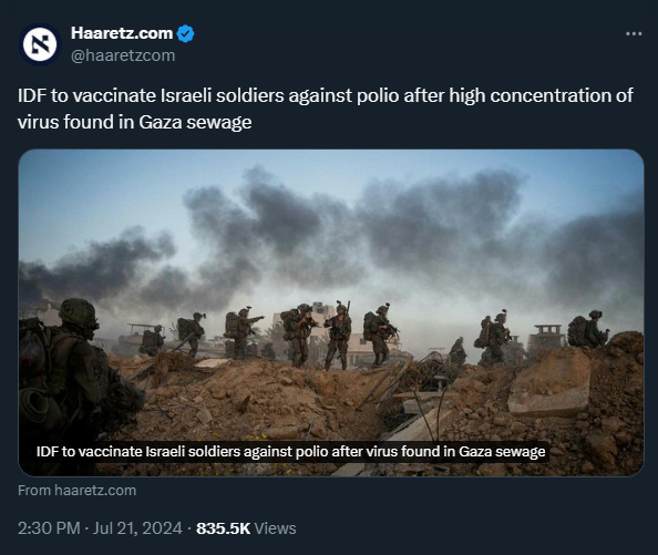 20240721 - news - Haartez reports Israeli invaders vaccinated against polio