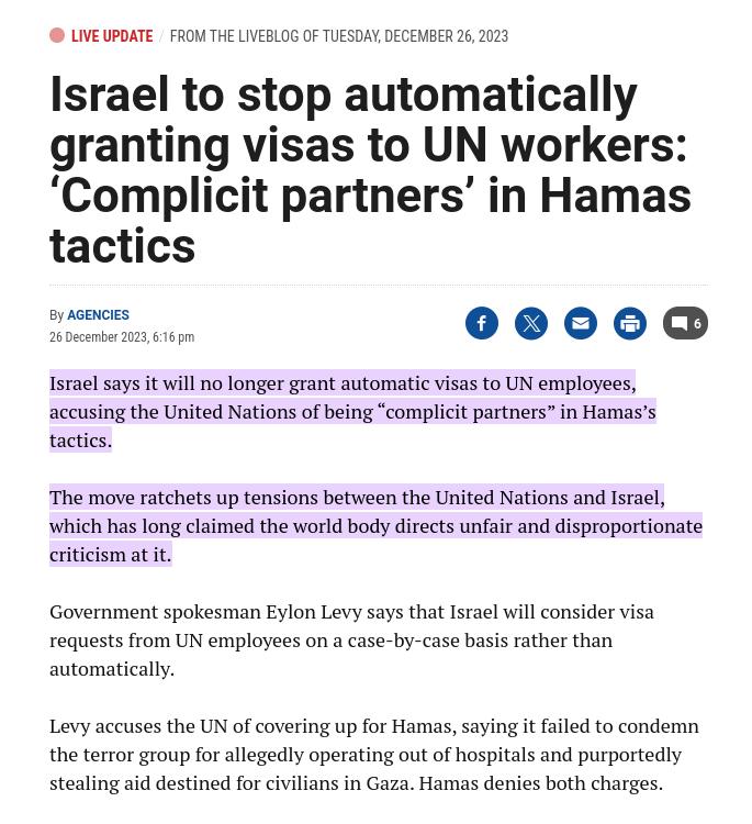 20231226 - Israeli news - Israel to stop automatically granting visas to UN workers - ‘Complicit partners’ in Hamas tactics