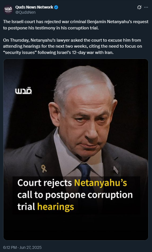 20250627 - Natenyahu's motives - Court rejects Netanyahu's request for postponing trial hearings.