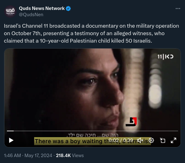 20240516 - Israeli female Zionist claims 10 years old boy killed 50 Israelis (image+video)