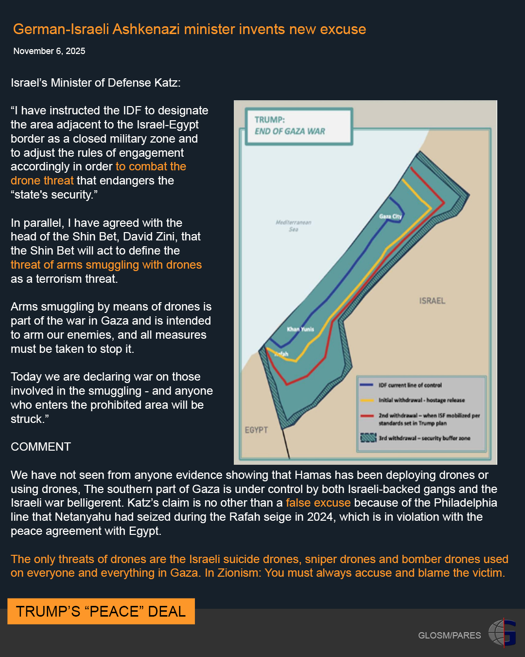 20251106 - Katz invents a new excuse: claims Hamas uses drones. (Hamas had shot down an Israeli drone in 2024)
